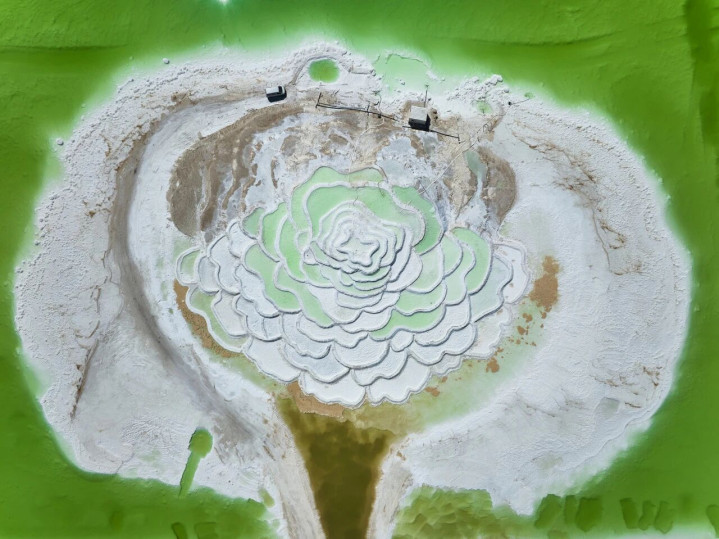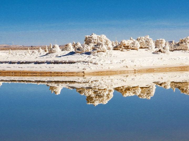 在干燥的状态下,高浓度的卤水接续析出结晶,造成一派片如树木般助长的盐柱,一眼望去,宛如一派“白色丛林”。