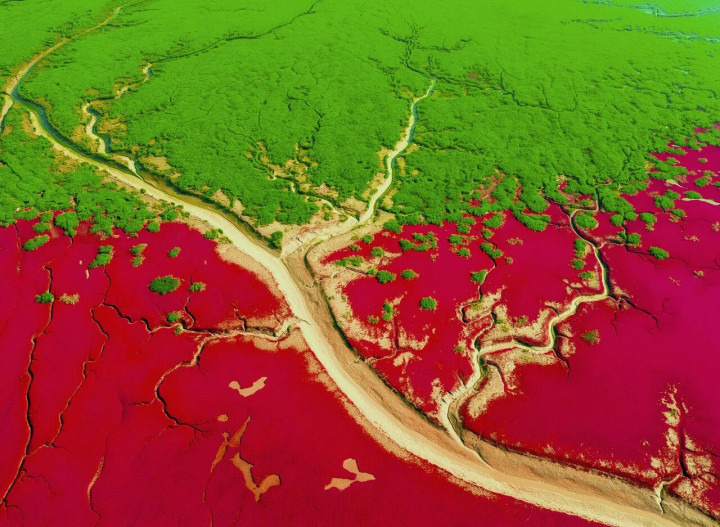 辽宁辽河入海口的盘锦“红海滩”长出“枝桠” 4月的盐地碱蓬萌芽呈优柔粉色 到9月时为浓艳红色