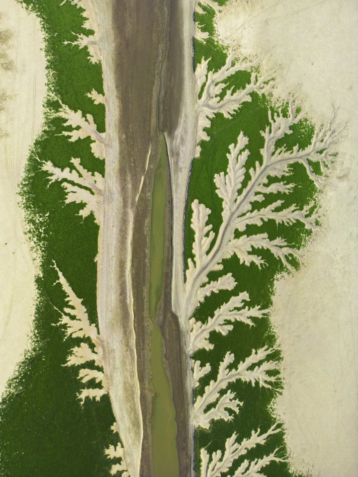 以江西鄱阳湖为例,作为中国第一大淡水湖,它是一个蒙胧型、季节性的湖泊,有着“丰水成面,枯水呈线”的独有性格。在枯水期,湖水退去,正本浩淼的水域化作一条条鬈曲的水线,这恰是“巨树”伸张开来的枝干。