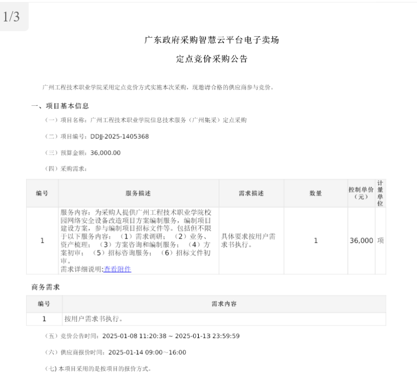 九派新闻注释到,在该技俩对应的采购公告中,广州工程本领事迹学院对于该项指标预算金额为最高限价3.6万元,技俩内容如下:详情一家供应商,为采购东说念主提供广州工程本领事迹学院校园汇聚安全开采校阅技俩决策编制做事,编制技俩栽植决策,参与编制技俩招标文献等。包括但不限于以下做事内容:(1)需求调研;(2)业务、钞票梳理;(3)决策掂量和编制做事;(4)决策初审;(5)招标掂量做事;(6)招标文献初审。