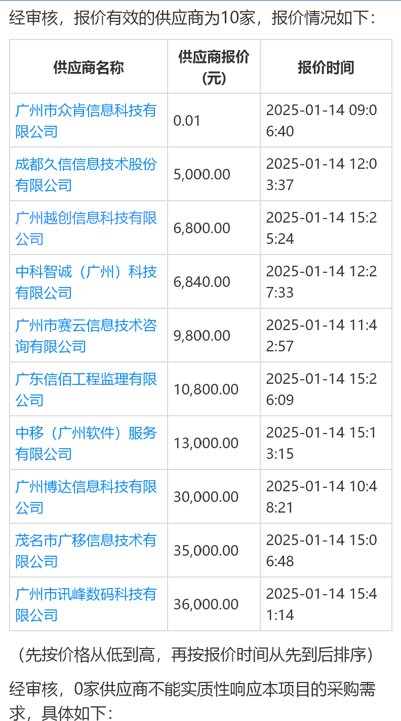 在呈现具体报价情况的表格中,按照价钱由低到高的法例,广州市众肯信息科技有限公司以0.01元的价钱排在第一,剩余9家供应商报价均在5000元至36000元不等。