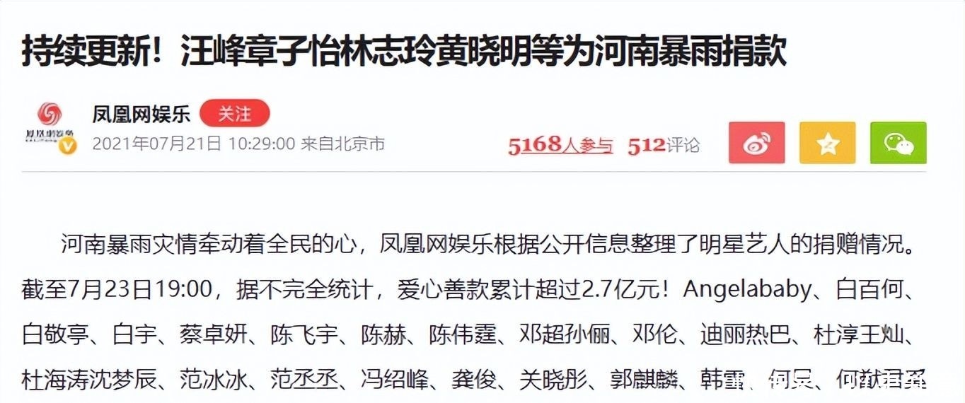 信源起原:凤凰网文娱 2021年07月21日 合手续更新!汪峰章子怡林志玲黄晓明等为河南暴雨捐钱