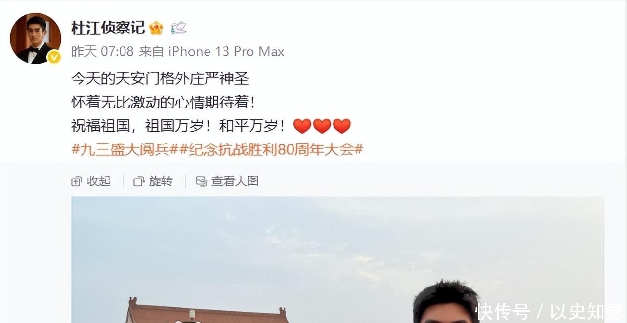 极目新闻 2025-09-03 演员杜江圆梦不雅礼九三检阅,爱妻霍念念燕晒照称“我勤劳在电视上找到你”
