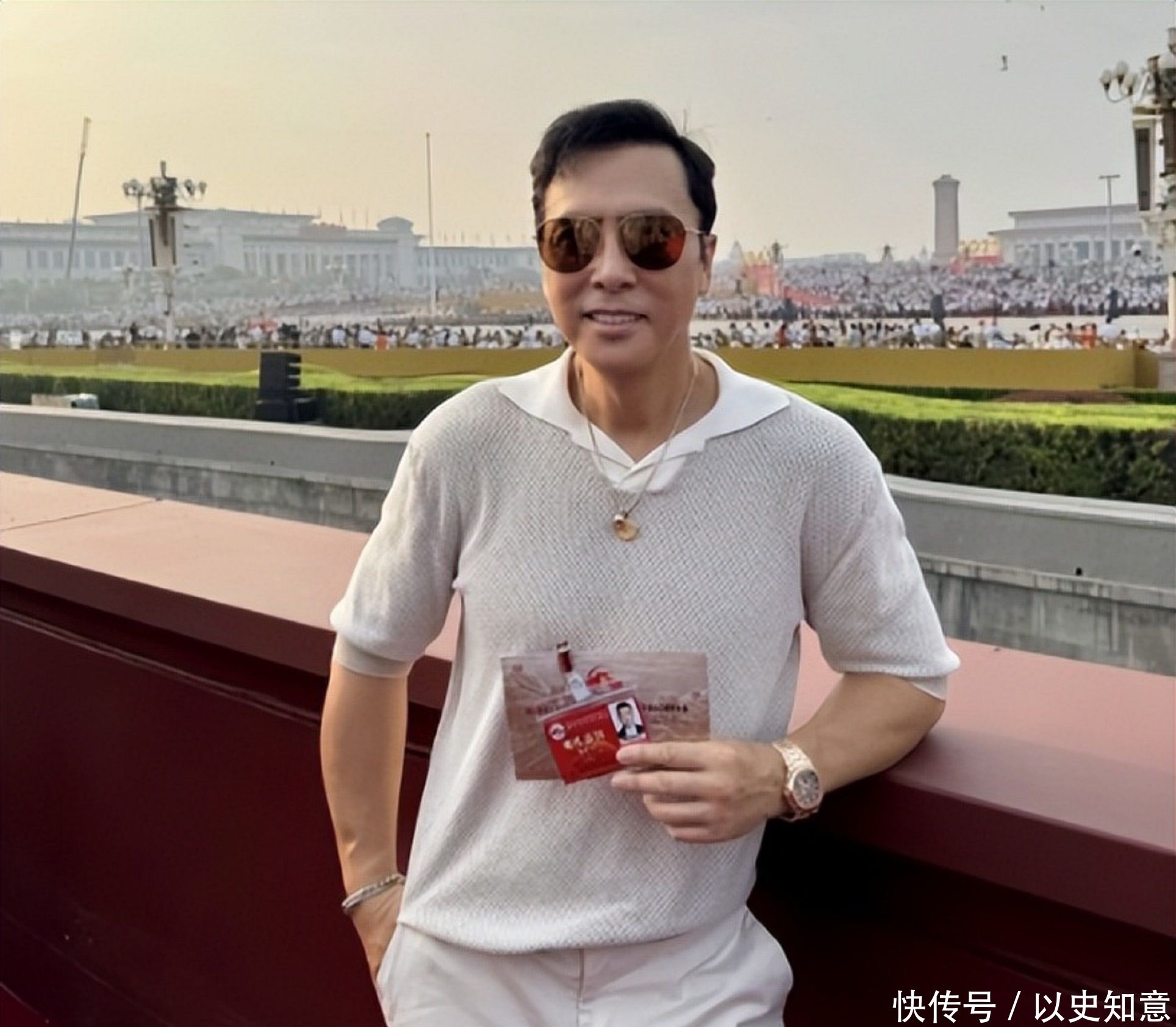 他手拿邀请函在天安门眼前,留住了属于我方的回忆。