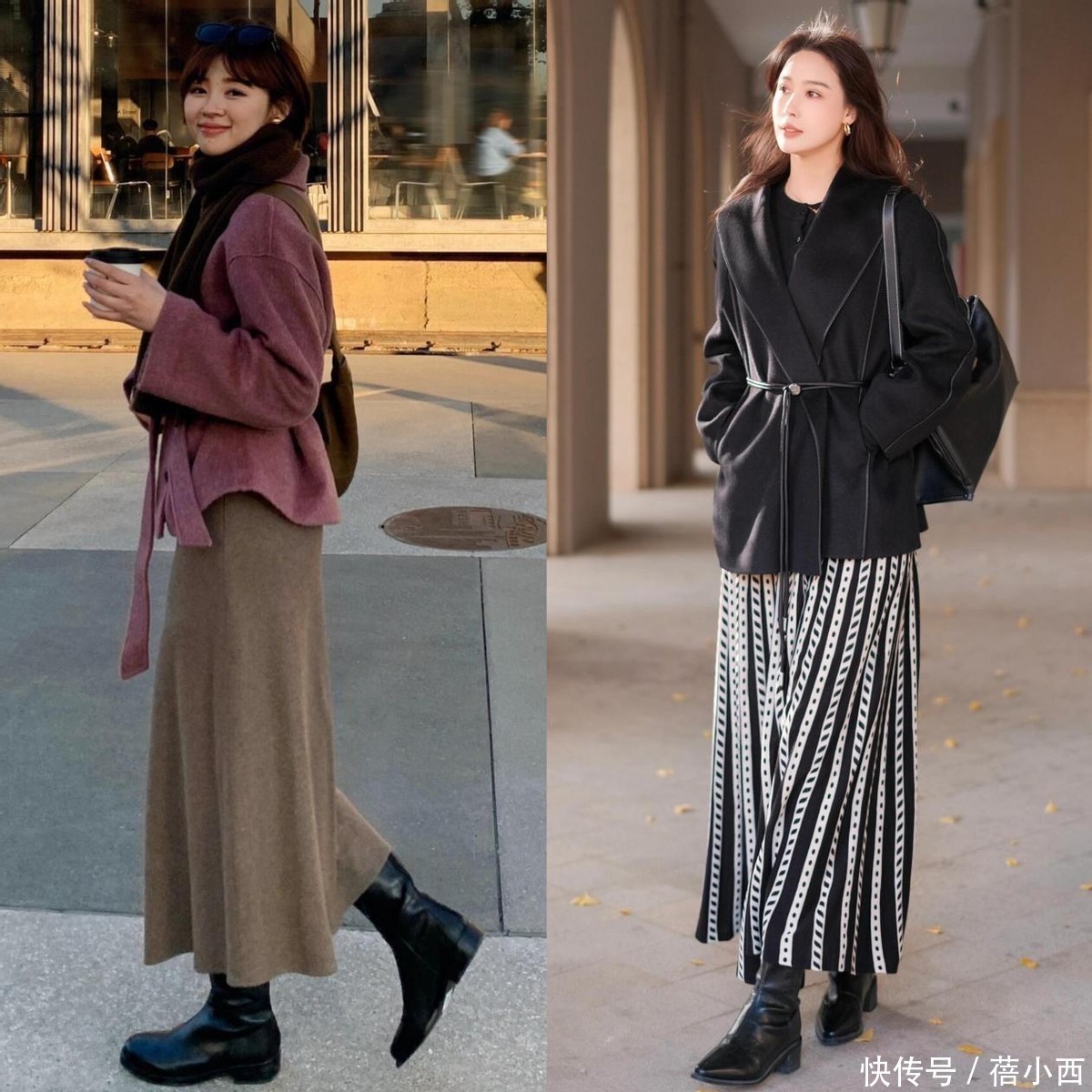 1,短靴搭配过膝半身裙