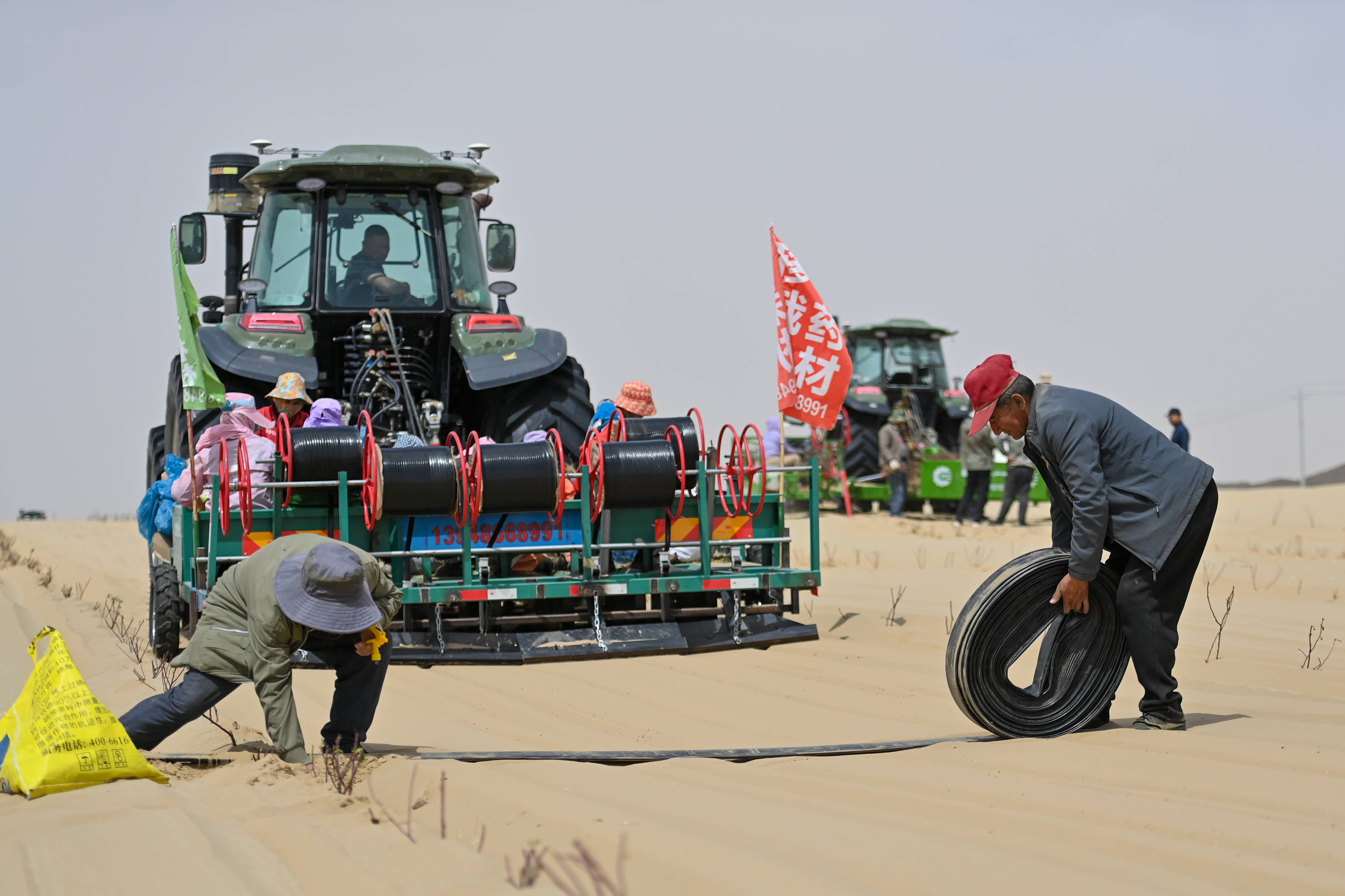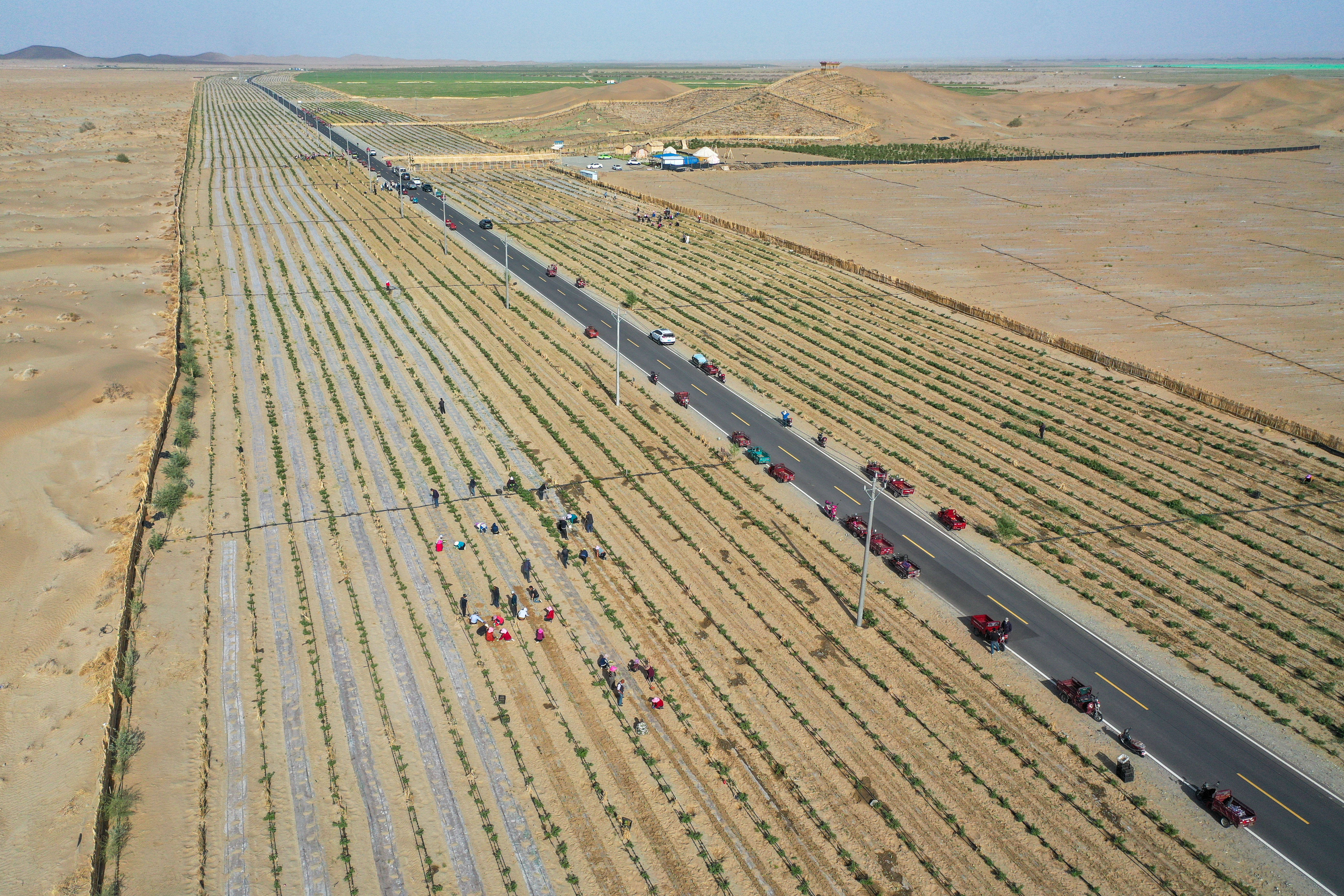 在新疆和郊外区于田县阗东防沙治沙示范区,当地村民驾驶机械移栽玫瑰和黄芩,并铺设滴灌带(4月15日摄)。 新华社记者 丁磊 摄防沙治沙的收效,大漠南北齐不鲜见。塔克拉玛干沙漠北缘的阿克苏地区沙雅县,阿克苏鑫奕泽农业科技有限公司教悔沙生植物4.6万亩,其中3万亩梭梭已接种肉苁蓉。