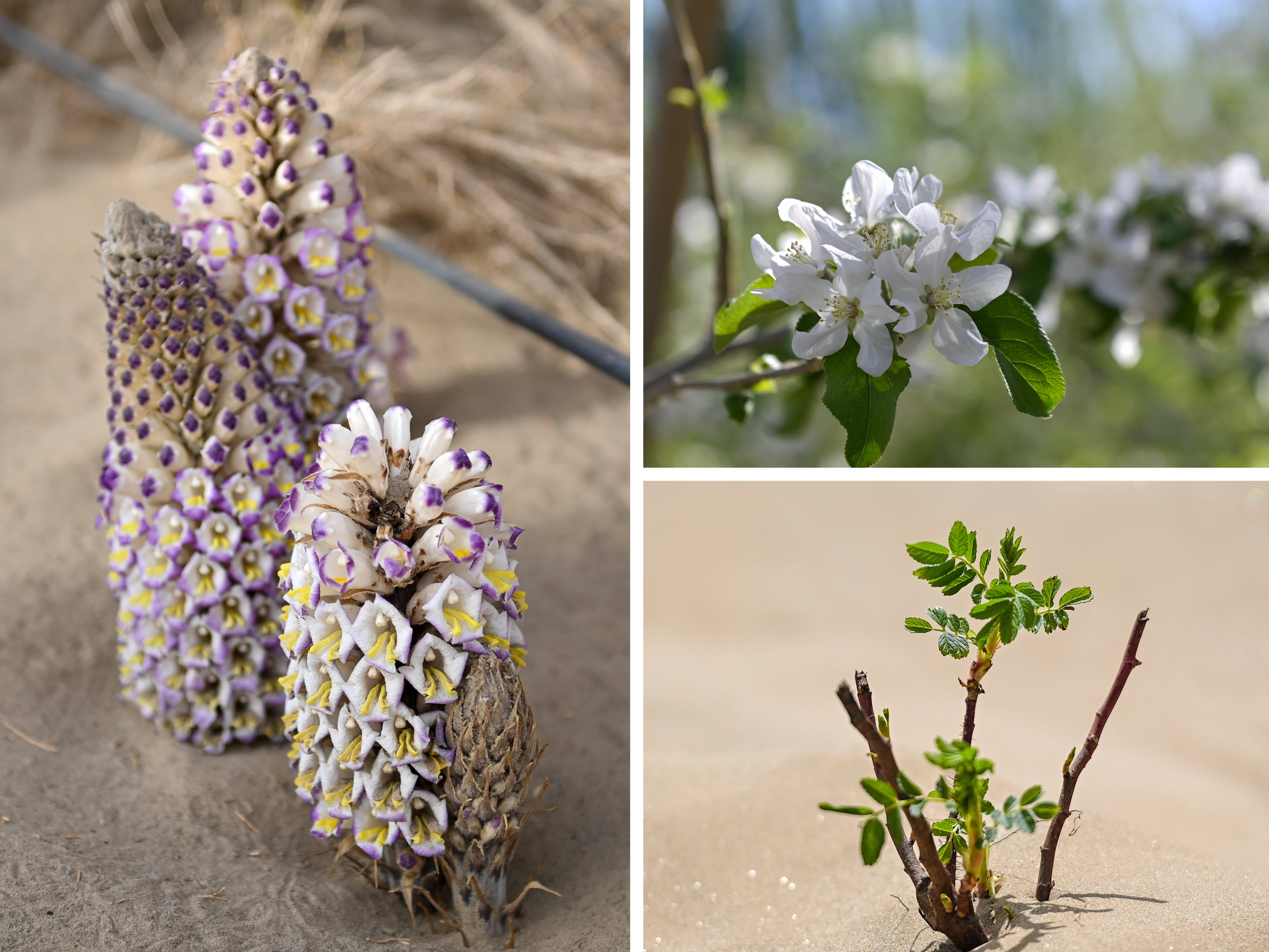 拼版像片:右上为在新疆阿克苏丰庆园农民专科互助社示范园拍摄的苹果花(4月14日摄);右下为在新疆和郊外区于田县阗东防沙治沙轮廓示范区拍摄的玫瑰花苗(4月15日摄);左为在新疆仙草蓉科技有限公司防沙治沙荒废植物示范园拍摄的肉苁蓉(4月13日摄)。新华社记者 丁磊 摄