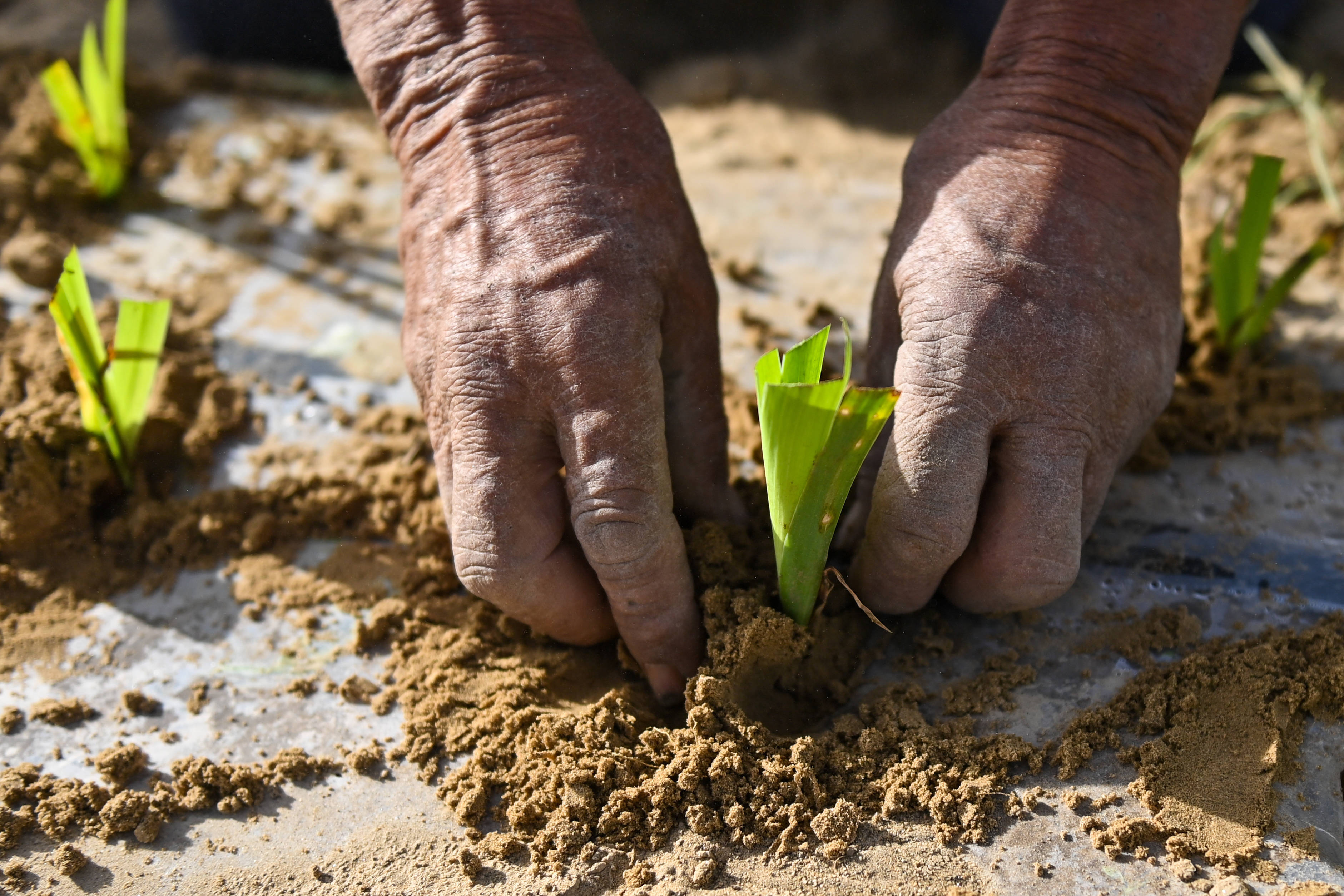 在新疆和郊外区于田县万花圃防沙治沙示范区,当地村民在栽种射干(4月15日摄)。新华社记者 丁磊 摄