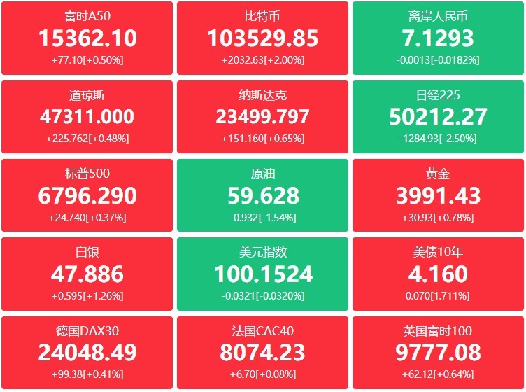 外盘:特朗普关税遭质疑且AI交游复苏,好意思股集体收涨,其中说念指涨225.86点,涨幅0.48%报47311.10点;纳指涨151.16点,涨幅0.65%报23499.80点;标普500涨24.74点,涨幅0.37%报6796.29点;谷歌涨超2%创历史收盘新高,特斯拉涨超4%,英特尔涨逾3%,Meta涨超1%,苹果、奈飞、亚马逊小幅上升;微软、英伟达跌超1%。Pinterest(PINS)跌超21%创该公司好意思国IPO以来第二最差单日进展;中概股涨跌不一,纳斯达克中国金龙指数涨0.15%,富途控股涨超4%,唯品会、好畴昔涨超2%,蔚来、霸王茶姬涨超1%,再鼎医药跌超4%,新东方、小鹏汽车跌逾3%,贝壳、BOSS直聘跌超2%。
