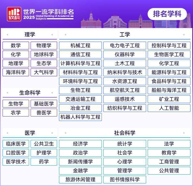 据了解,2025年的软科天下一流学科名次新增了东说念主工智能、机器东说念主科学与工程两个学科,名次学科数达到57个,隐敝理学、工学、人命科学、医学和社会科学五大限制。